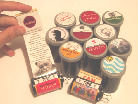 Reciclamos los chasis usados de rollos fotográficos y los reutilizamos, el lugar que ocupa la película es sustituida por una cinta impresa conteniendo textos e imágenes.